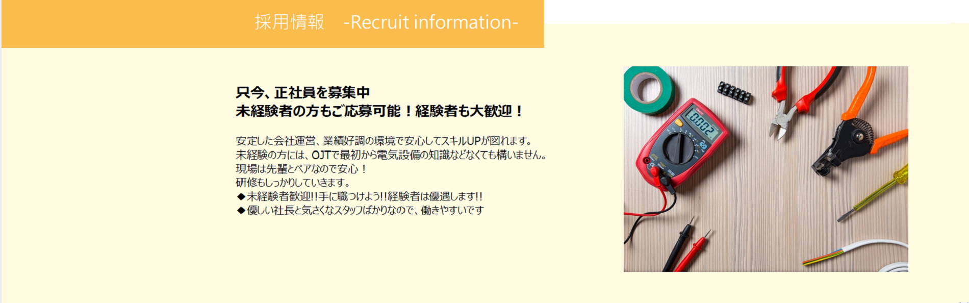 | 仕事内容 | 電気工事・空調設備業務の正社員を募集しております。 主に、ビル・マンションの電気工事・空調・リフォーム工事を行います。 企業様相手なので、現場はオフィスや公共施設、学校や病院などになります。 はじめは、アシスタントから経験していただき、免許が無くても始められる業務を習得し、できる幅を広げていっていただきます。 |
