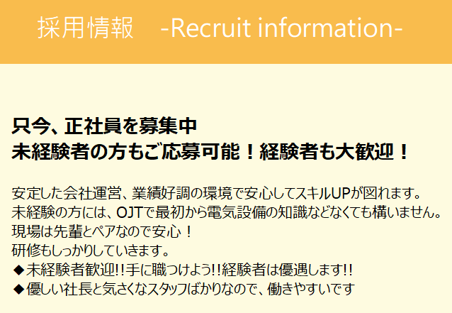 | 福利厚生 | 交通費全額支給、作業服支給、昇給有 資格取得支援有(講習等の費用全額負担) |